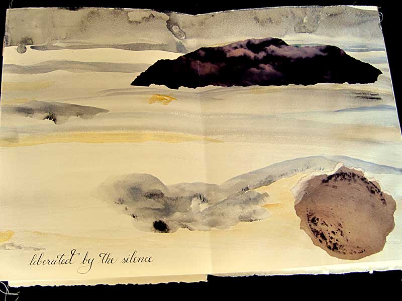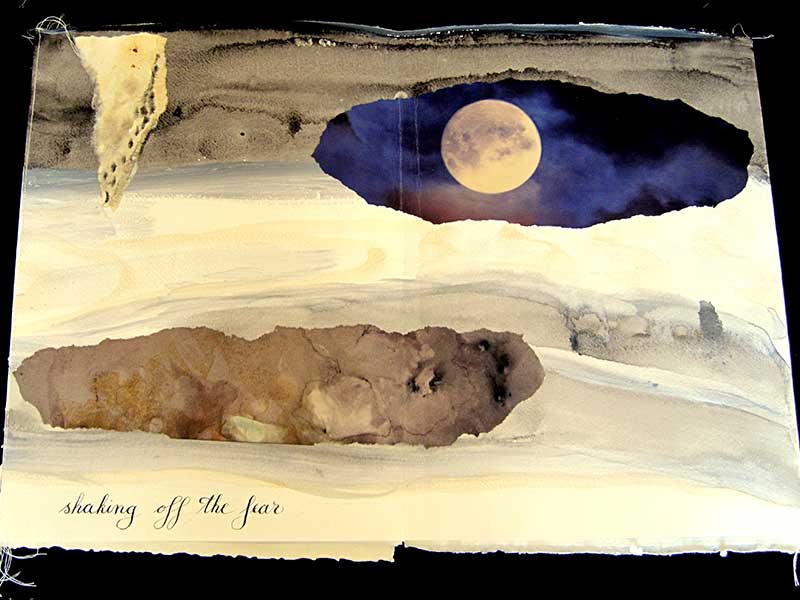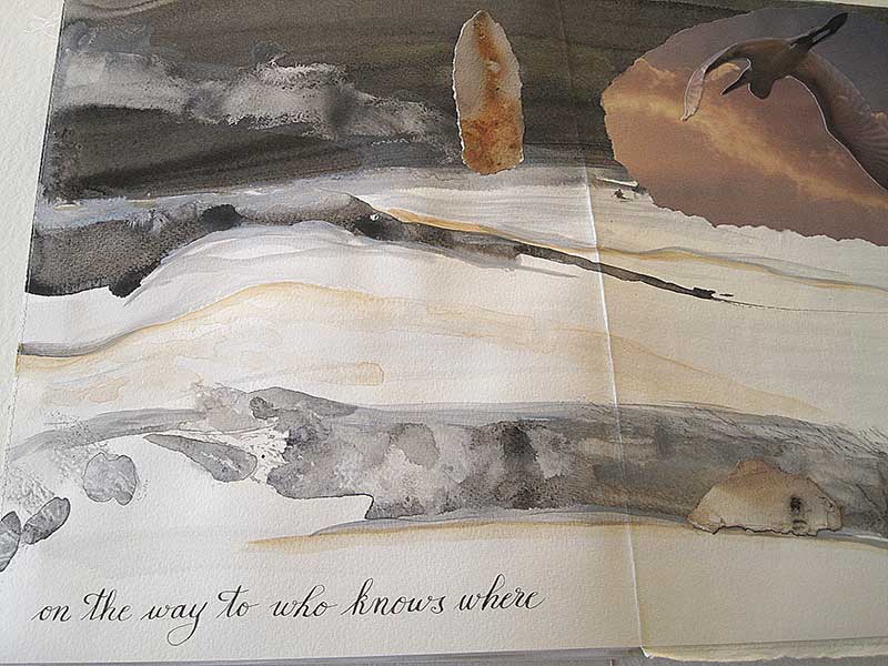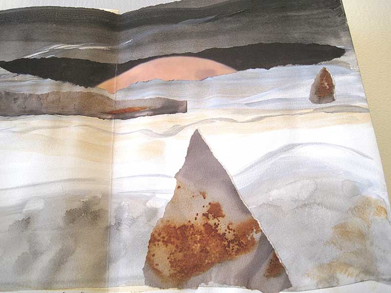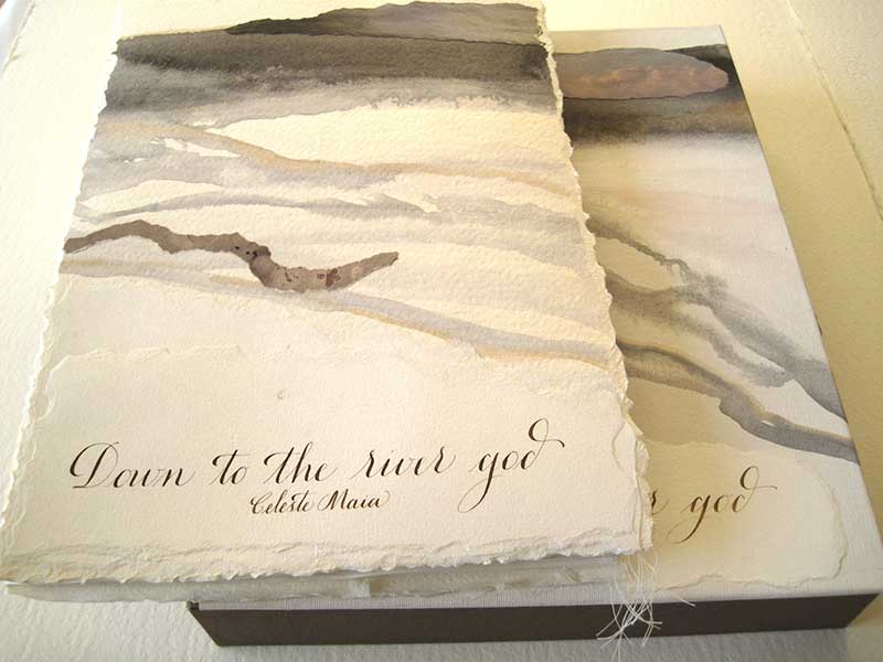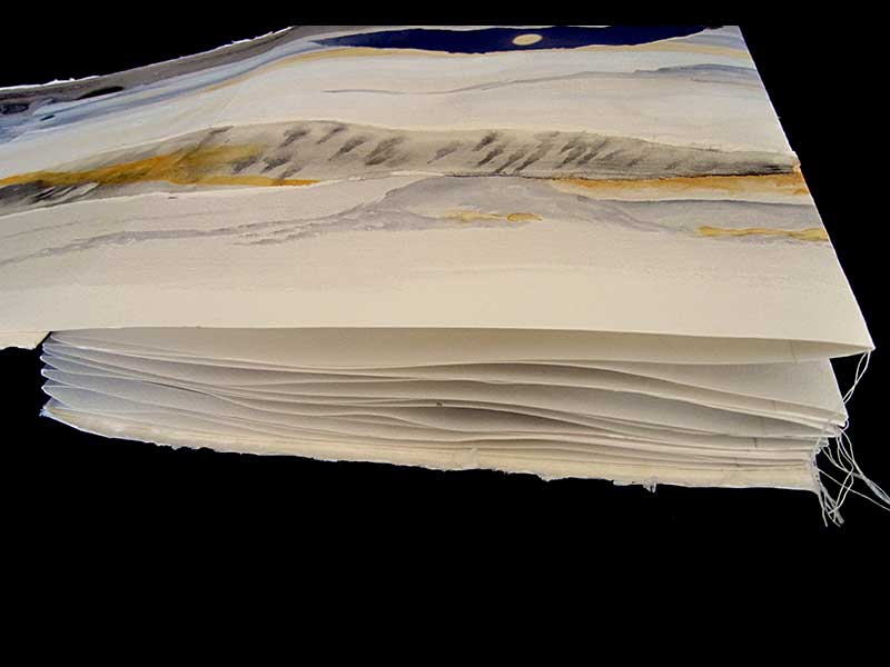 Acrylic and watercolor painted on Fabriano handmade paper with collages of rusted papers and torn photographs, plus calligraphy, machine sewn together in a 8-panel accordion. Presented in a painted canvas box. Unique. 24 cm X 34,5 cm